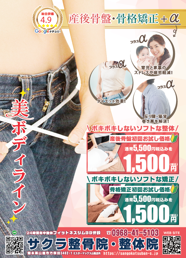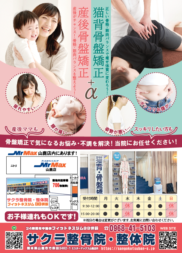 山鹿市サクラ整骨院では、産後骨盤矯正や猫背骨格矯正の専門知識を有した柔道整復師が在籍しております。