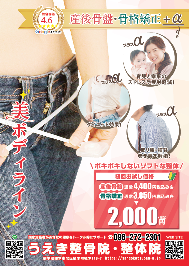 熊本市北区うえき整骨院では、産後骨盤矯正や猫背骨格矯正の専門知識を有した柔道整復師が在籍しております。