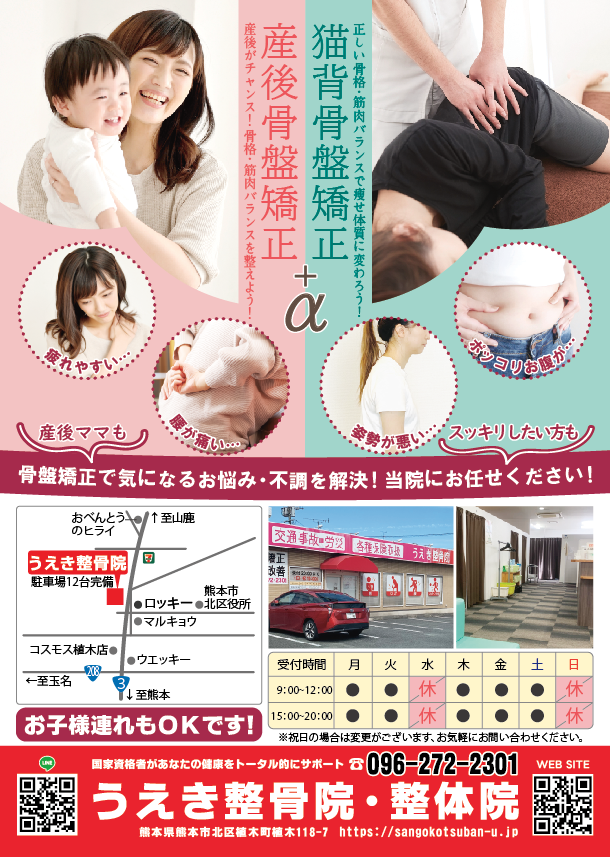 〔制作実績〕:産後骨盤矯正・猫背骨格矯正【熊本市北区うえき整骨院】ホームページ&チラシ制作